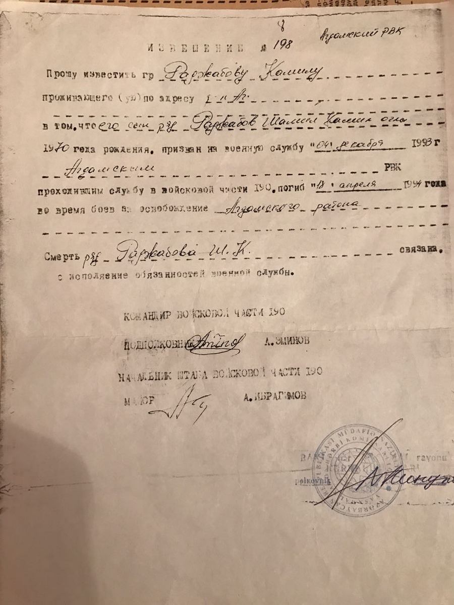 On 18 April 1994, he was martyred during heavy fighting in the village of Garvand in Aghdam.