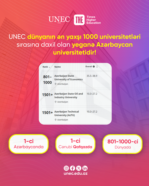 UNEC, впервые вошедший в этом году в мировой рейтинг университетов THE, поднялся на первое место в Азербайджане, первое на Южном Кавказе и на 801-1000-е место в мире.