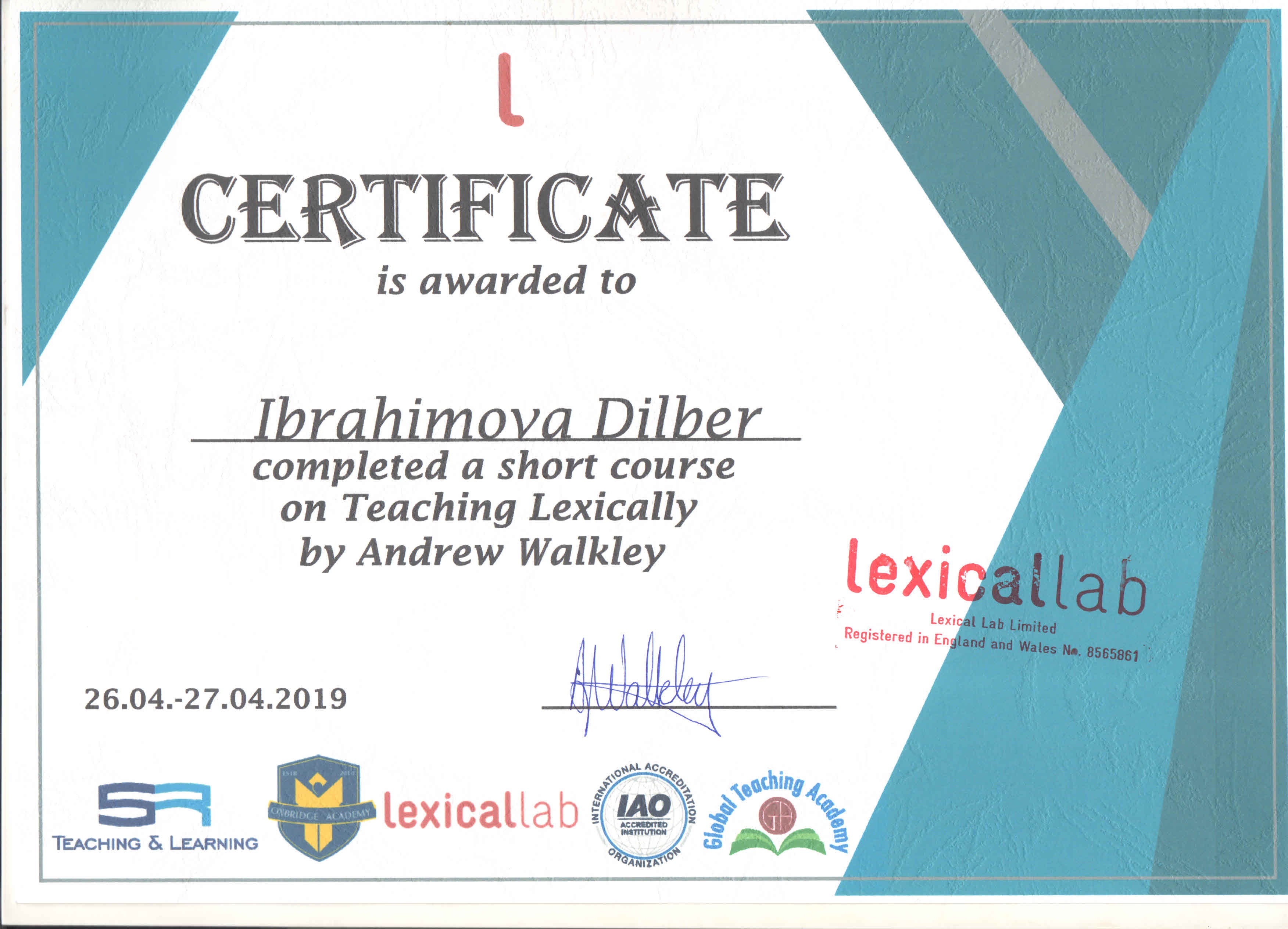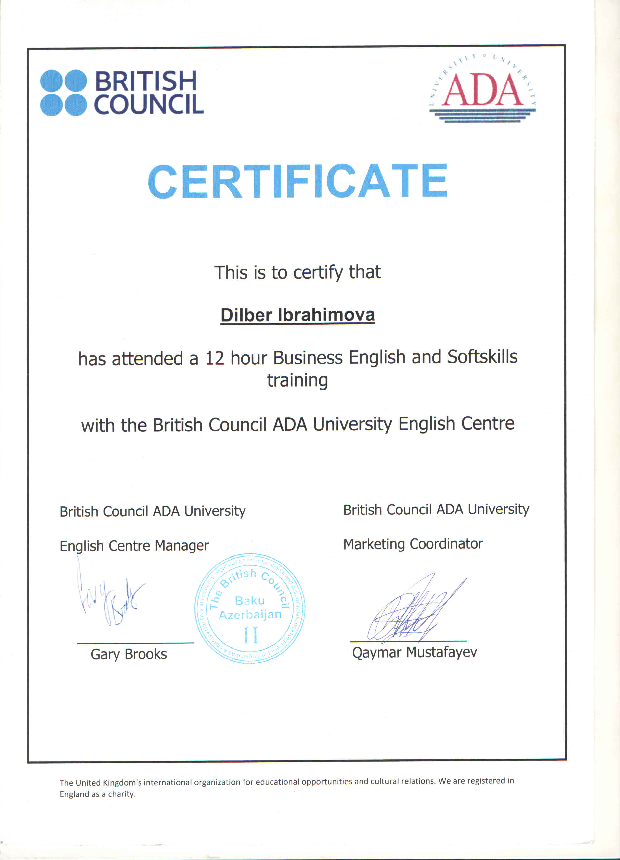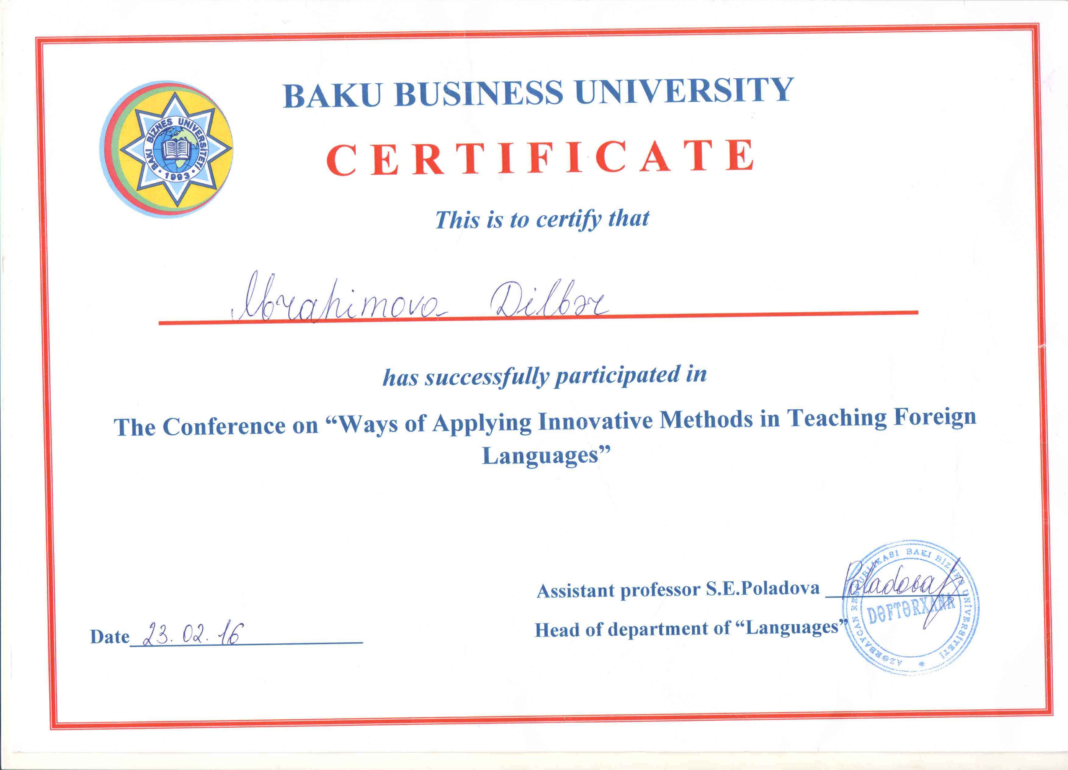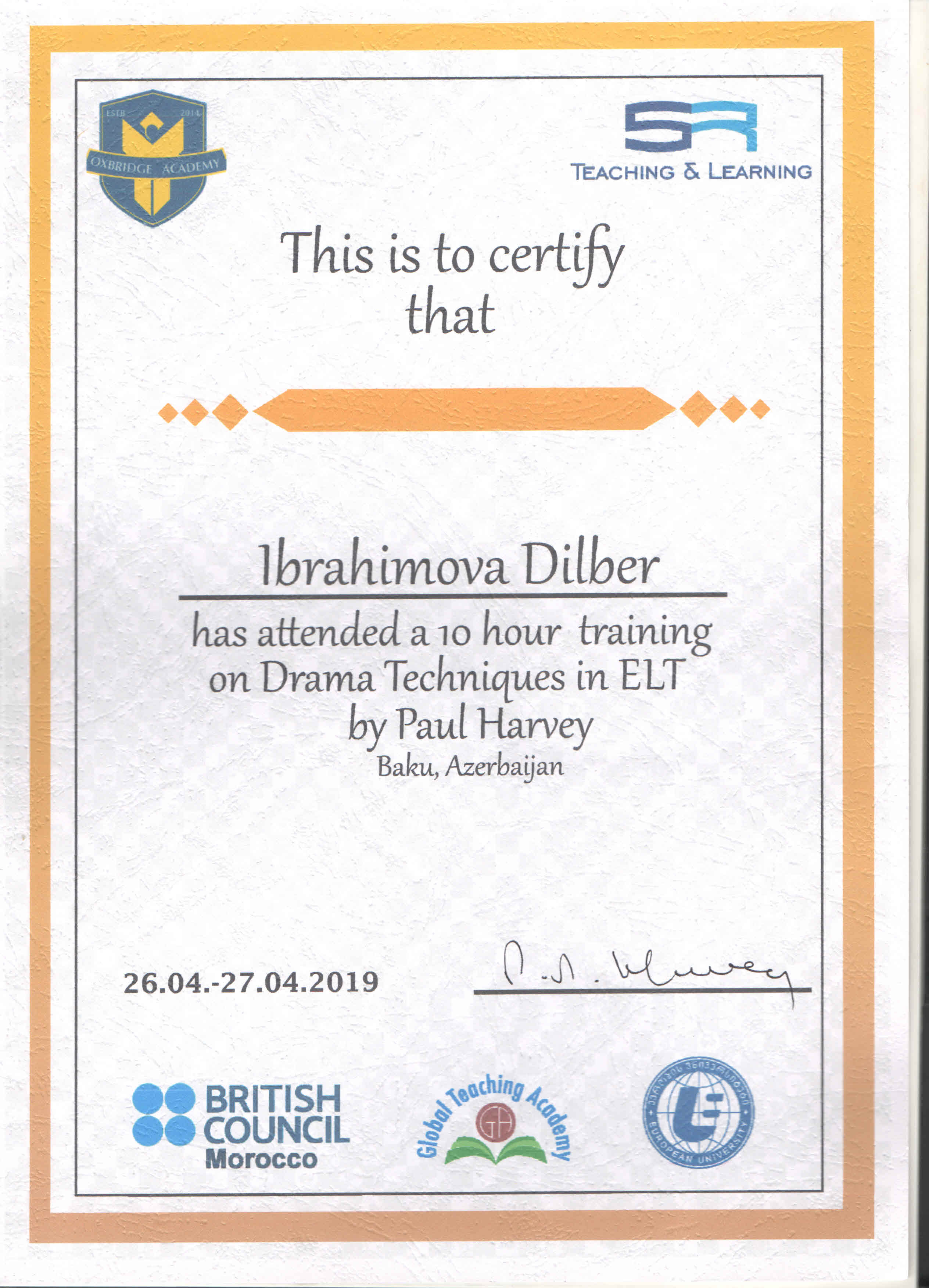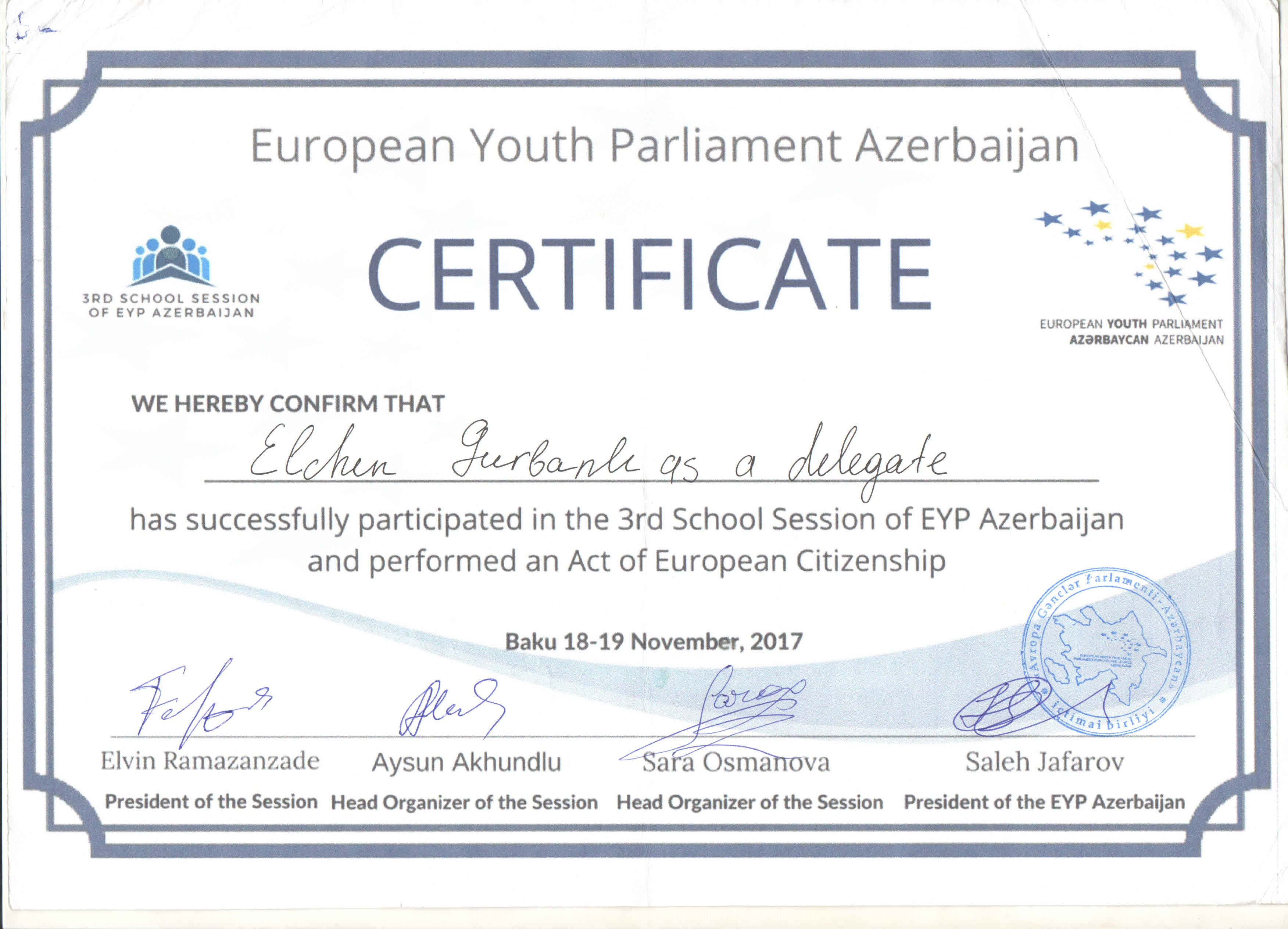 Milli Məclisdə Avropa İttifaqı tərəfindən təşkil etdiyi «Twinning» layihəsində tərcüməçilik fəaliyyətinə görə təşəkkürnamə ilə təltif olunmuşam.